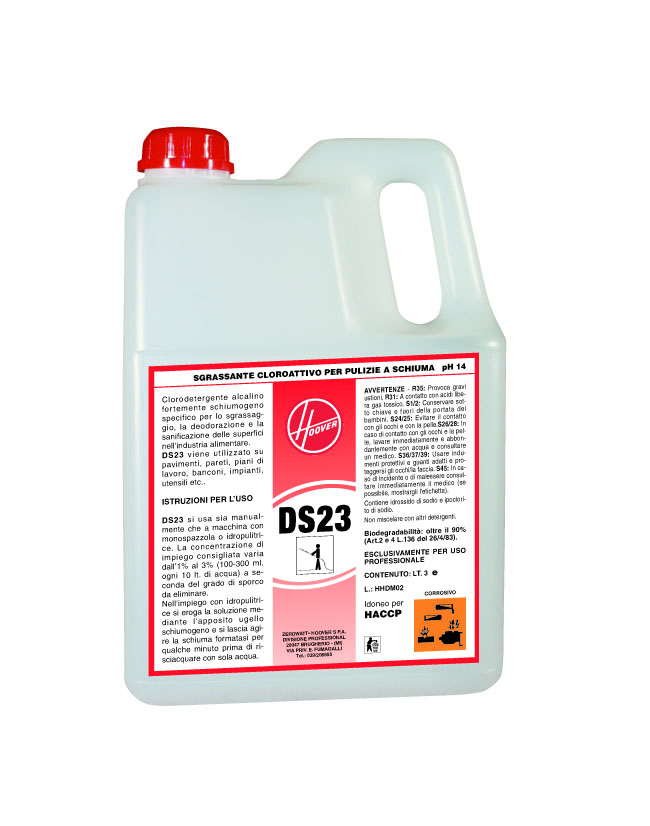 Clorodetergente alcalino fortemente schiumogeno specifico per lo sgrassaggio, la deodorazione e la sanificazione delle superfici nell’industria alimentare. DS23 viene utilizzato su pavimenti, pareti, piani di lavoro, banconi, impianti e utensili, elimina forti accumuli di grasso, sangue e muffe.
