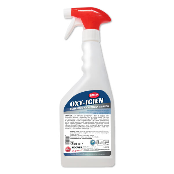 OXY-IGIEN è un detergente igienizzante a base di ossigeno attivo ( perossido d’idrogeno) e solventi per tutte le superfici lavabili .